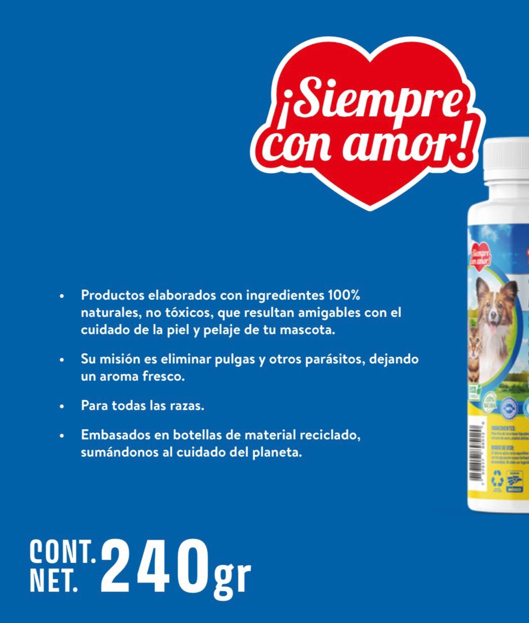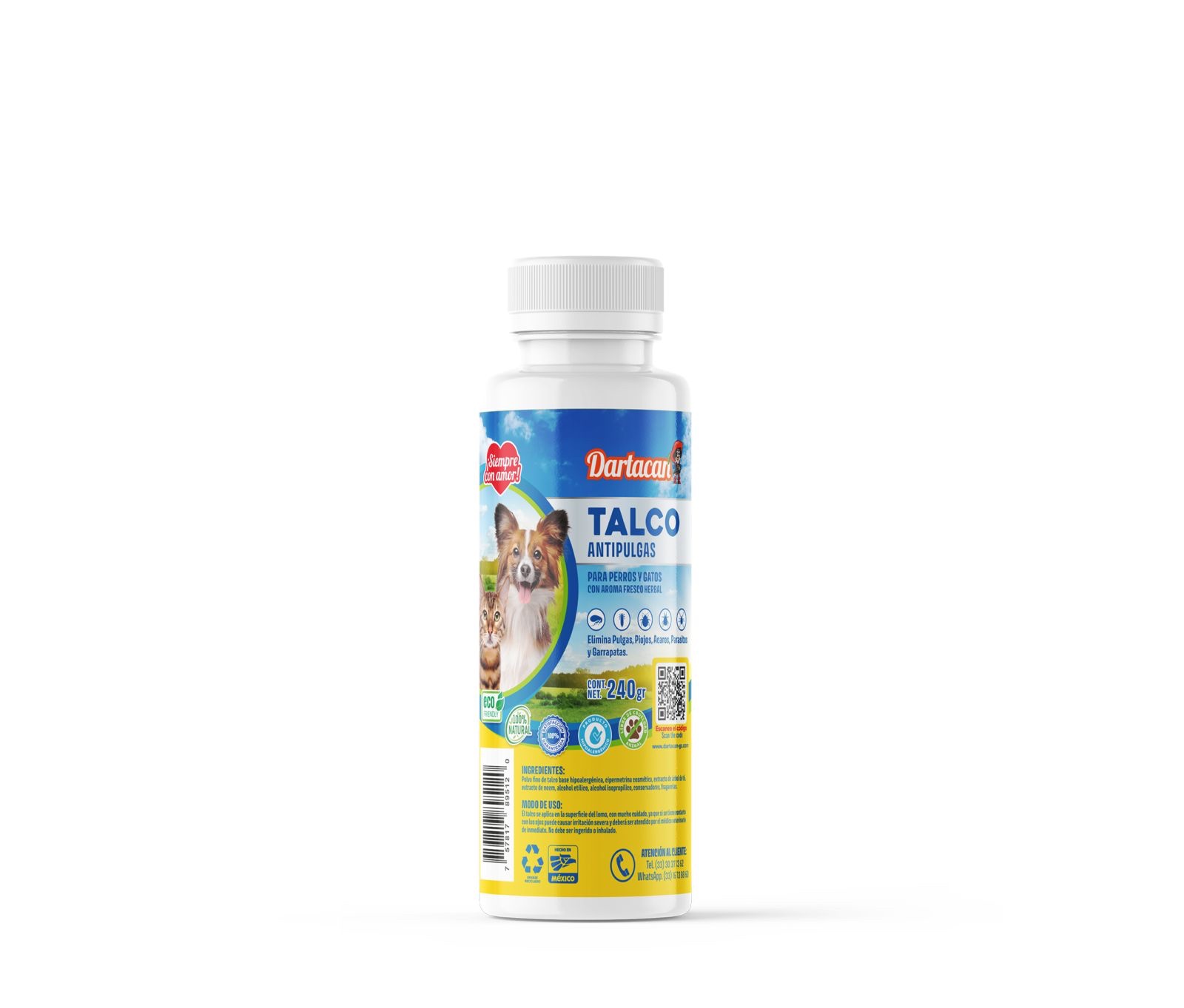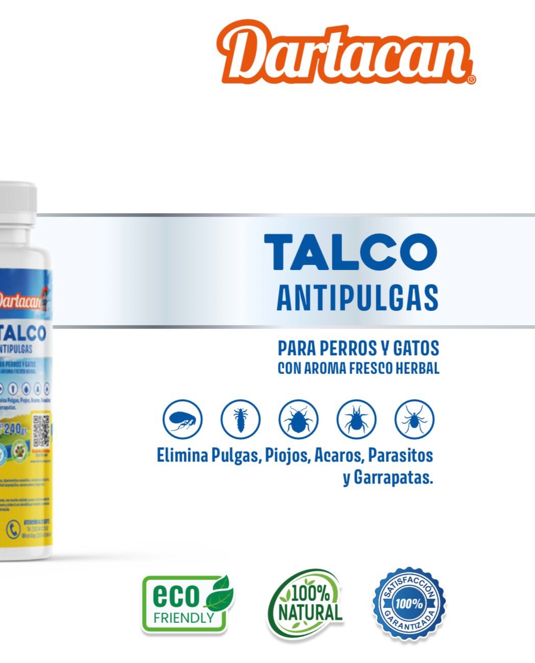 Talco Antipulgas 240gr para perros y gatos, aroma fresco herbal.